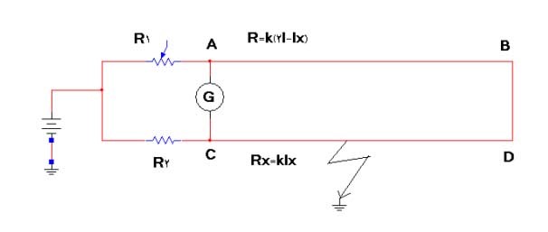 (سرهای AوB) و با وصل کردن یک مقاومت ثابت و یک مقاومت متغیر و وصل آنها به یک منبع مستقیم یک پل اندازه گیری بسازیم. دو انتهای کابل (سرهای CوD) نیز باید به یکدیگر متصل شوند. زمانی که گالوانومتر به حالت تعادل برسد(هیچ جریانی از آن عبور نکند) با استفاده از محاسبات زیر می توان فاصله محل عیب را تا سرکابل پیداکرد. برای به تعادل رسیدن گالوانومتر باید مقاومت متغیر را آنقدر تغییر داد تا هیچ جریانی از آن عبور نکند.
