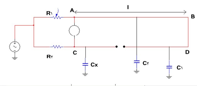 برای تعیین محل پارگی بازهم باید یک پل اندازه گیری درست کنیم اما اینبار از یک منبع ولتاژ متناوب استفاده می کنیم تا بتوانیم با اندازه گیری خازن موجود در خط محل عیب را پیداکنیم. دستگاه اندازه گیری مورد نیاز نیز آمپرمتر A.Cخواهد بود. اگر پس از تنظیم مقاومت متغیر آمپرمتر هیچ جریانی را نشان نداد پل اندازه گیری به تعادل رسیده است و می توان با محاسبات زیر محل عیب را پیداکرد.